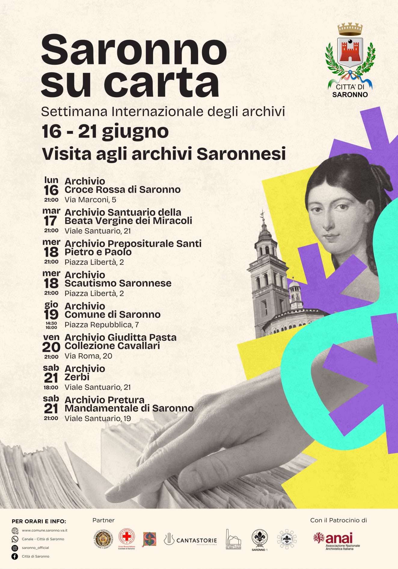 “Saronno su carta” – Settimana Internazionale degli Archivi dal 16 al 21 giugno 2025 L’iniziativa, promossa dal Comune di Saronno con il patrocinio di ANAI e la partecipazione di numerosi partner culturali, rappresenta un’occasione preziosa per riscoprire la storia custodita negli archivi cittadini, molti dei quali generalmente non accessibili al pubblico – Visite serali e pomeridiane agli archivi storici della città